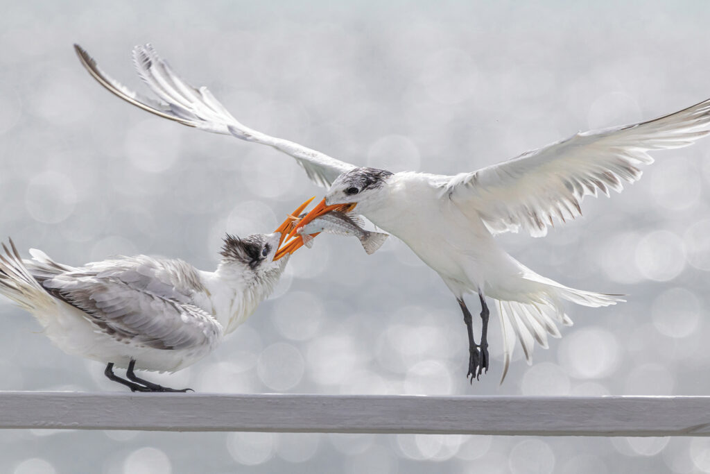 Réaliser cette image a exigé patience, sens du détail et, surtout, la capacité d’endurer une chaleur accablante. Sans relâche, la Sterne royale adulte sillonnait le ciel, cherchant de quoi nourrir ses petits qui l’attendaient sagement sur une rambarde. On croit souvent que le dévouement et la tendresse envers sa progéniture sont propres aux humains, mais la nature, une fois encore, démontre le contraire. J’éprouve un immense respect pour les efforts de ces oiseaux : immortaliser cet instant fut un privilège, qui justifiait chaque minute d’attente et chaque goutte de sueur.