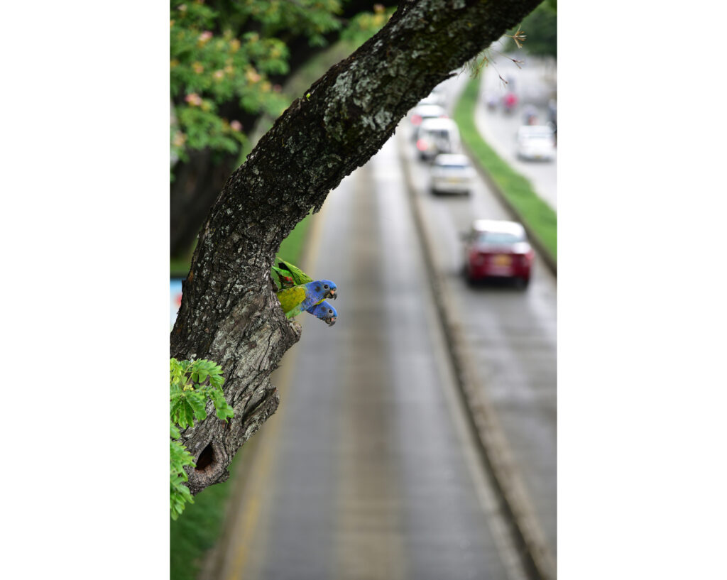 Ce jour-là, je photographiais des arbres bordant une piste cyclable le long d’une route très fréquentée, lorsque j’ai gravi une passerelle pour varier mon angle de vue. C’est alors que mon regard a croisé celui de perroquets à tête bleue, perchés dans un creux, curieux et attentifs. Cette scène raconte une histoire singulière : en contrebas, les automobilistes poursuivent leur routine quotidienne, tandis qu’au-dessus, ces oiseaux nous observent, témoins silencieux de vies humaines trop pressées pour remarquer les multiples expressions de la nature qui les entoure.
