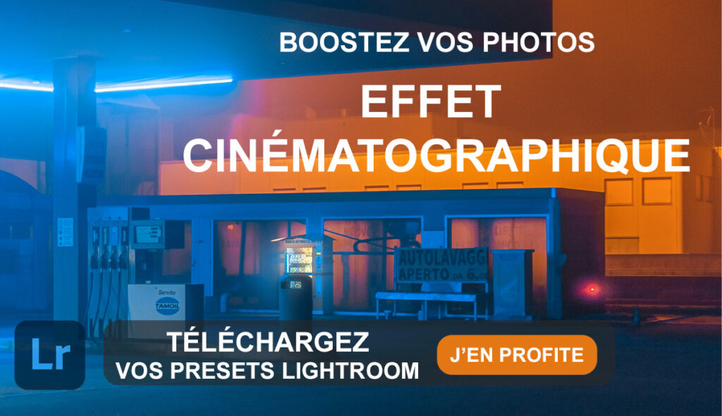 Vous pouvez également ajuster l’exposition, le contraste et la balance des blancs pour sculpter l’image. Un contraste maîtrisé permet d’accentuer la profondeur et d’ajouter du dynamisme à la scène. Pour renforcer l’esthétique cinématographique, vous pouvez intégrer un léger grain qui imite la texture des films argentiques. Certains outils permettent également d’ajouter des flares et des effets de lumière, très fréquents dans l’univers du cinéma. Enfin, pour un style cinématographique automatique, vous pouvez opter pour le pack de 101 presets Lightroom cinématographique qui offre un rendu professionnel en un seul clic.