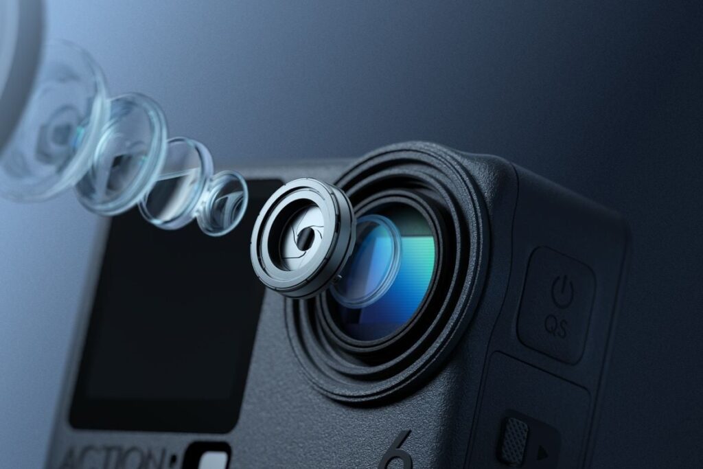 La DJI Osmo Action 6 devient également la première caméra d’action à proposer une ouverture mécanique variable de f/2.0 à f/4.0. Jusqu’à présent, les caméras d’action utilisaient des ouvertures fixes (souvent f/2.8) ou des solutions logicielles et filtres pour gérer l’exposition. Ici, la mécanique permet un vrai contrôle de la lumière entrante. En ouvrant jusqu’à f/2.0, on maximise la captation dans des conditions de faible lumière ; en fermant jusqu’à f/4.0, on peut gérer les scènes très lumineuses, améliorer la profondeur de champ et éviter l’usage prioritaire de filtres ND. Dans un environnement urbain de nuit ou lors d’une action au lever du soleil, cette ouverture variable peut ainsi faire la différence. En outre, l’association de cette ouverture avec l’option d’un objectif macro optionnel permet de réduire la distance de mise au point à 11 cm environ, ouvrant des usages macro très atypiques pour une action-cam.