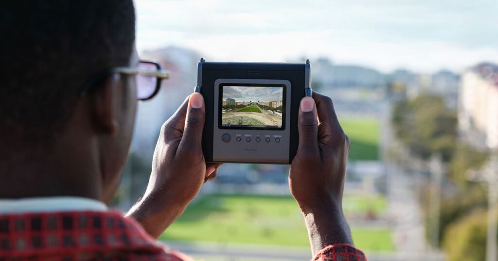 L’Instax Wide Evo arbore un design rétro rappelant les appareils télémétriques classiques, avec une finition en simili-cuir noir et des accents chromés. L’ergonomie a été soigneusement travaillée pour garantir une expérience utilisateur optimale. La disposition des boutons et des molettes est à la fois logique et accessible, permettant de contrôler facilement les différents paramètres. En particulier, les molettes de sélection des effets et le levier d’impression rappellent les sensations des anciens appareils photo argentiques. La touche de modernité s’incarne à travers un écran LCD arrière de 3,5 pouces. Celui-ci facilite le cadrage, la navigation dans les menus et l’application des effets. Il offre une interface conviviale pour visualiser et sélectionner les images avant impression.
