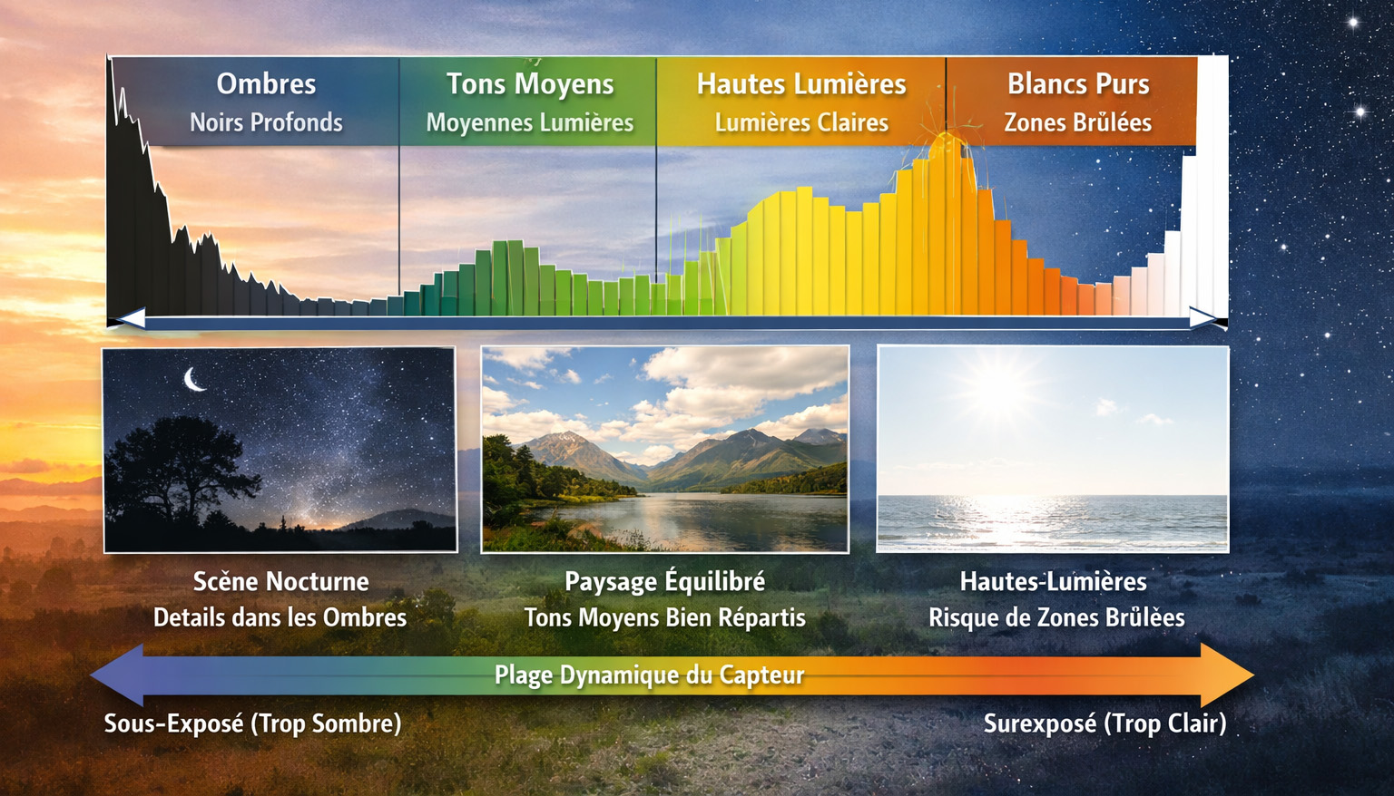 Le concept d’exposer repose sur une réalité technique propre aux capteurs numériques. Contrairement à l’œil humain, un capteur enregistre l’essentiel de l’information dans les hautes lumières. Plus on s’approche du blanc sans le dépasser, plus le signal est riche, propre et précis. À l’inverse, les zones sombres contiennent peu d’informations utiles et sont beaucoup plus sujettes au bruit numérique. Exposer à droite consiste donc à exploiter cette caractéristique en poussant volontairement l’exposition vers les valeurs lumineuses les plus élevées possibles, tout en évitant le clipping irréversible des hautes lumières importantes. L’objectif n’est pas d’obtenir une image finale claire ou surexposée, mais de produire un fichier RAW contenant un maximum d’informations, notamment dans les zones sombres qui seront ensuite rééquilibrées en post-traitement.