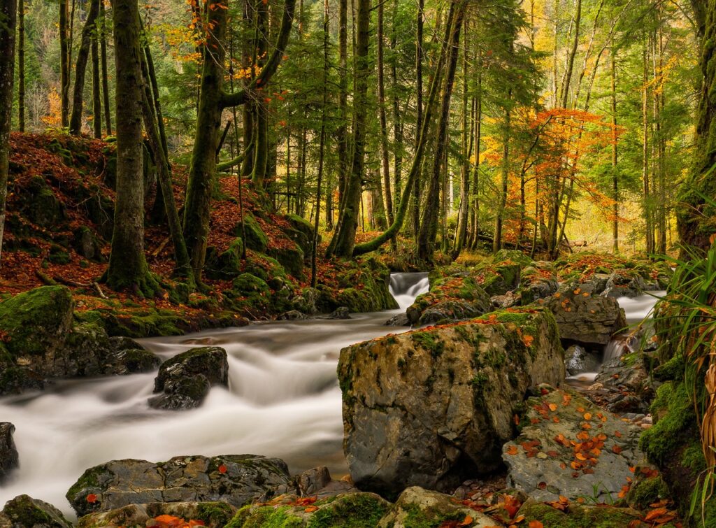 Lorsque les premiers froids s’installent, le Jura se métamorphose. Les montagnes, les vallées encaissées et les forêts se couvrent d’une palette que seul l’automne peut offrir. Les érables et les hêtres embrasent les flancs des collines, tandis que les lacs du plateau – Chalain, Bonlieu, Ilay – reflètent ces nuances comme des miroirs géants. La photographie y devient un dialogue entre l’eau et la lumière. Pour obtenir des reflets parfaits, il est préférable d’attendre la fin de matinée, quand le vent tombe et que la surface de l’eau devient lisse. Un filtre polarisant peut aider à saturer les couleurs et à réduire les reflets indésirables. Au lever du jour, les brumes s’élèvent souvent des lacs : un moment à saisir absolument. En ajustant la balance des blancs sur une température légèrement plus chaude, les tons dorés se révéleront avec douceur. Les cascades du Hérisson, quant à elles, se prêtent à la pose longue. Un trépied, un filtre ND et une vitesse de 1/4 à 2 secondes suffisent pour transformer le flux de l’eau en soie mouvante.
