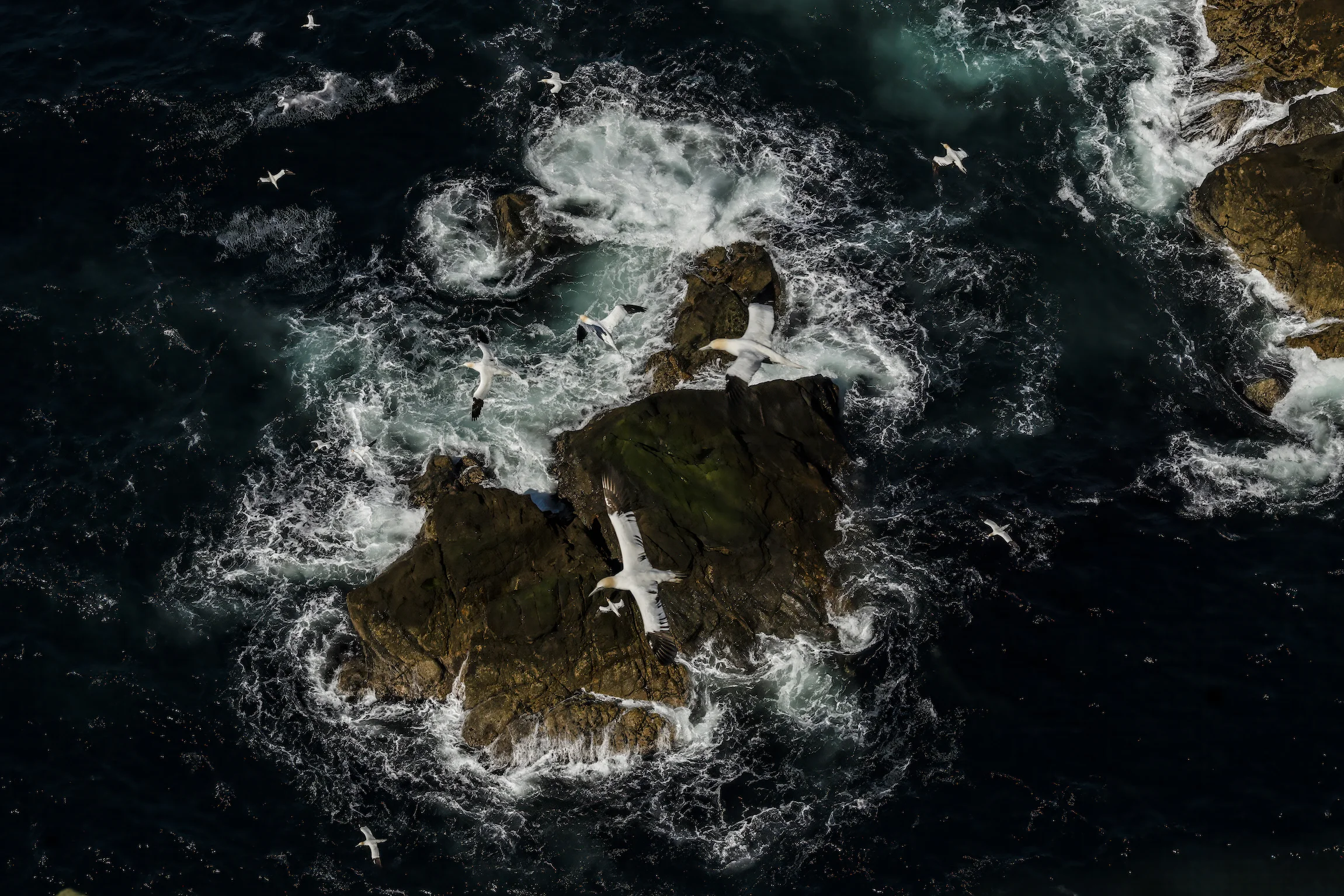 Les falaises d’Hermaness, abruptes et battues par les vents, offrent un sanctuaire idéal pour la nidification : les courants ascendants y facilitent l’envol comme l’atterrissage. Chaque printemps, des milliers de fous de Bassan regagnent ces hauteurs, formant l’une des plus vastes colonies du Royaume-Uni. Photographier ces scènes spectaculaires au bord de précipices culminant à près de 200 mètres, sous des rafales pouvant atteindre 30 km/h, a représenté un véritable défi technique — mais aussi une expérience inoubliable au plus près de la nature sauvage.