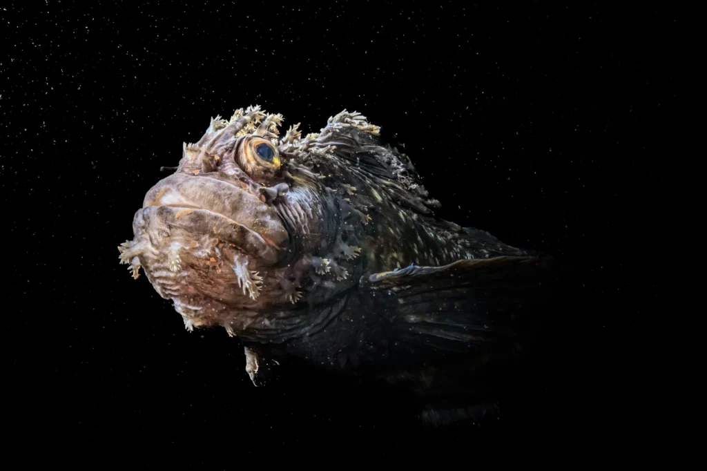 Cette image d’un Chirolophis japonicus a été réalisée en mer du Japon, à quelque 80 kilomètres au sud-ouest de Vladivostok, en Russie. J’ai découvert ce poisson orné vers 30 mètres de profondeur, abrité sous la poupe d’une épave. Curieusement, cette espèce ne manifeste aucune crainte face aux plongeurs – bien au contraire. Celui-ci semblait intrigué par ma présence, allant jusqu’à tenter de se poser sur le hublot de mon caisson photo, comme s’il cherchait à nouer un contact. Une rencontre inattendue, presque complice, dans l’obscurité silencieuse des fonds marins.