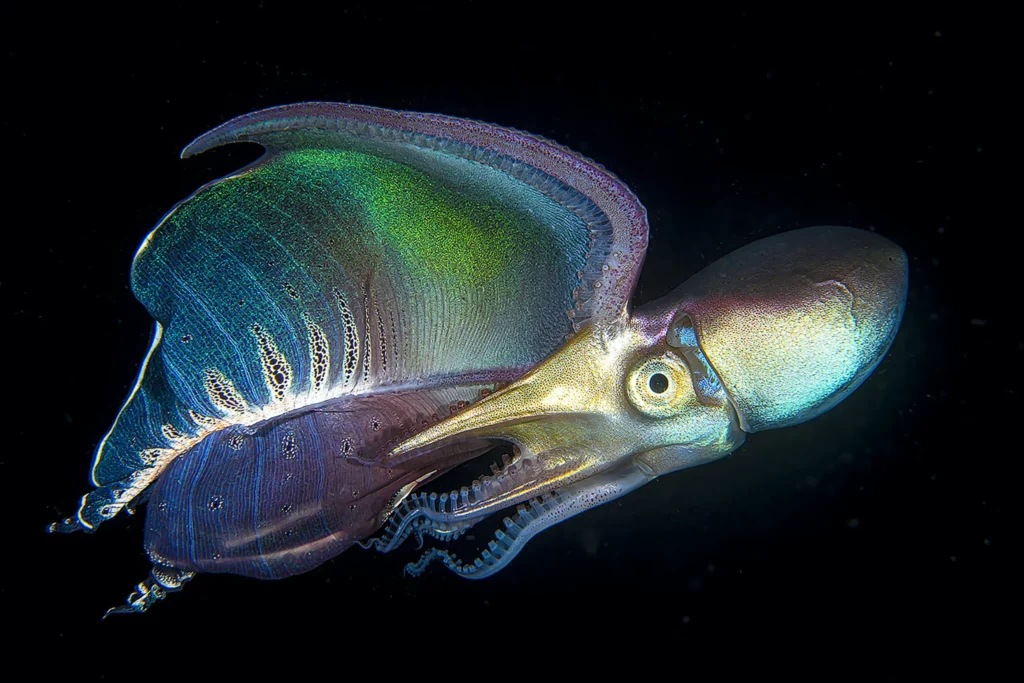 Au cours d’une de mes nombreuses plongées en eaux noires à Anilao, aux Philippines, mon guide et moi avons repéré une forme étrange, aux mouvements saccadés, flottant à une vingtaine de mètres de profondeur. Elle mesurait entre 10 et 15 centimètres. Très vite, nous avons compris qu’il s’agissait d’une rare pieuvre-couverture (Tremoctopus sp.), une espèce rarement observée. À notre approche, elle a déployé sa spectaculaire membrane, révélant un manteau aux reflets chatoyants. J’ai eu le temps de saisir quelques images avant qu’elle ne disparaisse dans l’obscurité. Ce moment de grâce m’a profondément marquée : rencontrer un tel céphalopode dans son élément relève du privilège. Parmi ses nombreuses singularités, cette espèce est connue pour présenter l’un des dimorphismes sexuels les plus extrêmes du règne animal, les femelles pouvant peser jusqu’à 40 000 fois plus que les mâles.