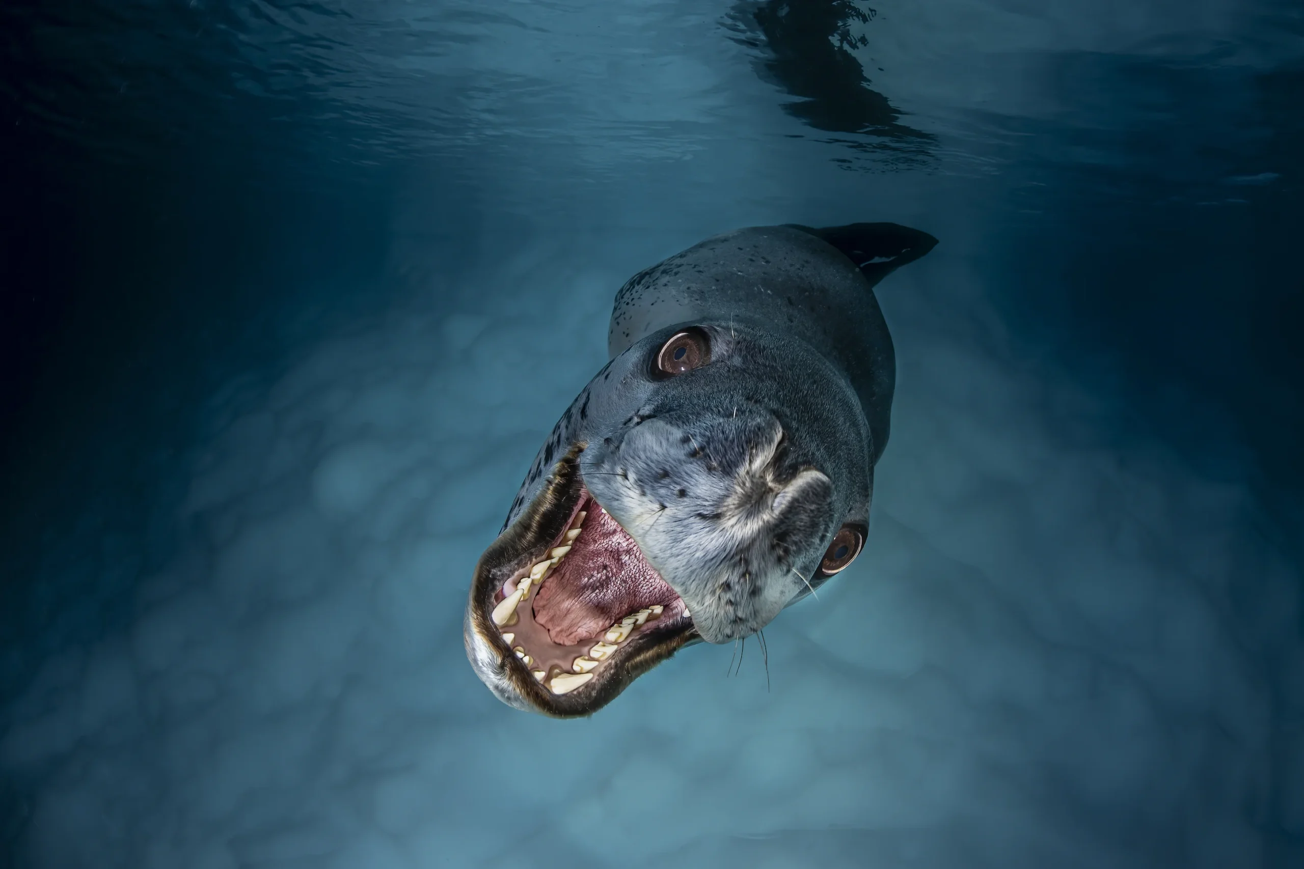 Les voyages dans la péninsule Antarctique sont toujours synonymes de rencontres étonnantes avec des léopards de mer (Hydrurga leptonyx). S’approchant avec audace, les dents découvertes, cet individu tenait à me faire comprendre que cette partie de l’Antarctique était son territoire. Cette photo a été prise au crépuscule, ce qui crée une atmosphère plutôt maussade.