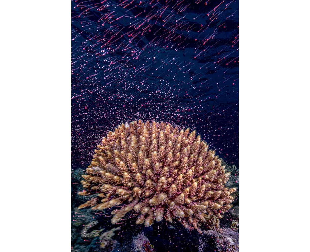 Les coraux sont des animaux, et voici comment ils se reproduisent. Dévoiler le monde caché de la reproduction corallienne révèle l’un des spectacles les plus extraordinaires de l’océan. Tel un mécanisme d’horlogerie, des milliers de coraux, sur des centaines de kilomètres, se synchronisent pour libérer des amas d’œufs et de spermatozoïdes en pleine mer. Capturer cet événement fugace est un véritable défi : il ne se produit qu’une fois par an, lors d’une nuit précise d’un mois particulier, pendant quelques minutes seulement. L’utilisation d’une vitesse d’obturation lente, au moment où les vagues se brisent et emportent les amas flottants vers le haut, transforme la scène en une pluie d’étoiles filantes sous-marine et colorée. Cette image fait partie d’un projet de documentaire scientifique en cours, explorant la vie nocturne foisonnante et les rituels de reproduction des coraux du nord de la mer Rouge, un projet nourri par plus de 300 nuits passées sous l’eau pendant la saison de ponte.