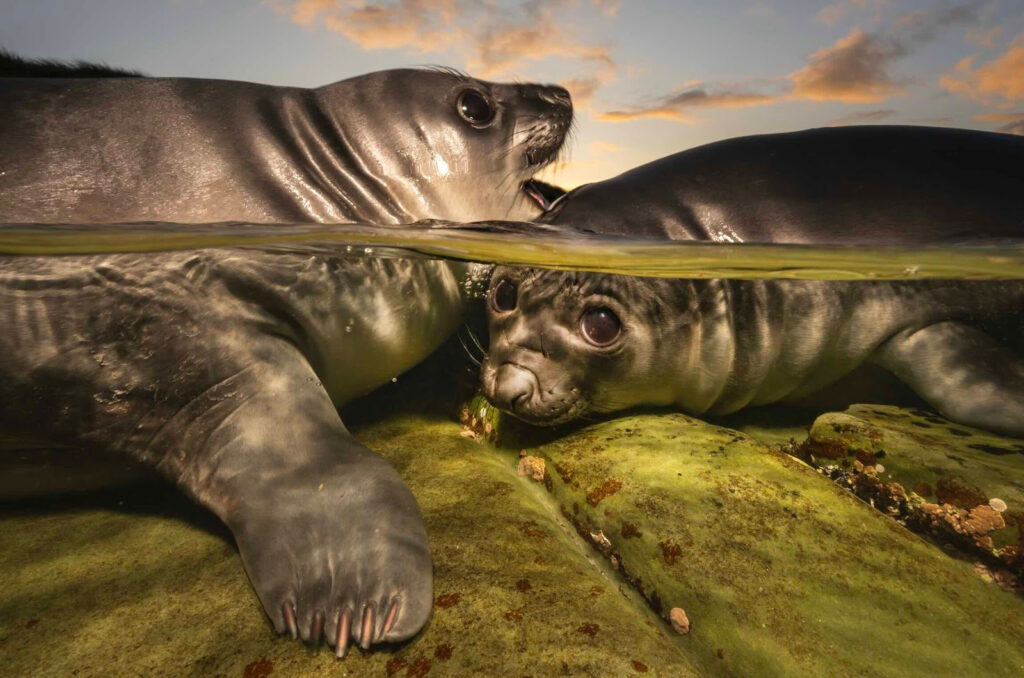 Après quelques semaines, une fois le sevrage achevé, les jeunes éléphants de mer sont laissés sur le rivage, contraints de faire face seuls à leurs premiers défis. Sur Sea Lion Island, aux îles Malouines, j’ai vu des dizaines de ces juvéniles évoluer dans de petites cuvettes rocheuses, se bousculant et se hissant les uns sur les autres, tentant d’apprivoiser l’eau avec une maladresse attendrissante, tout en manifestant une réelle curiosité à mon égard.