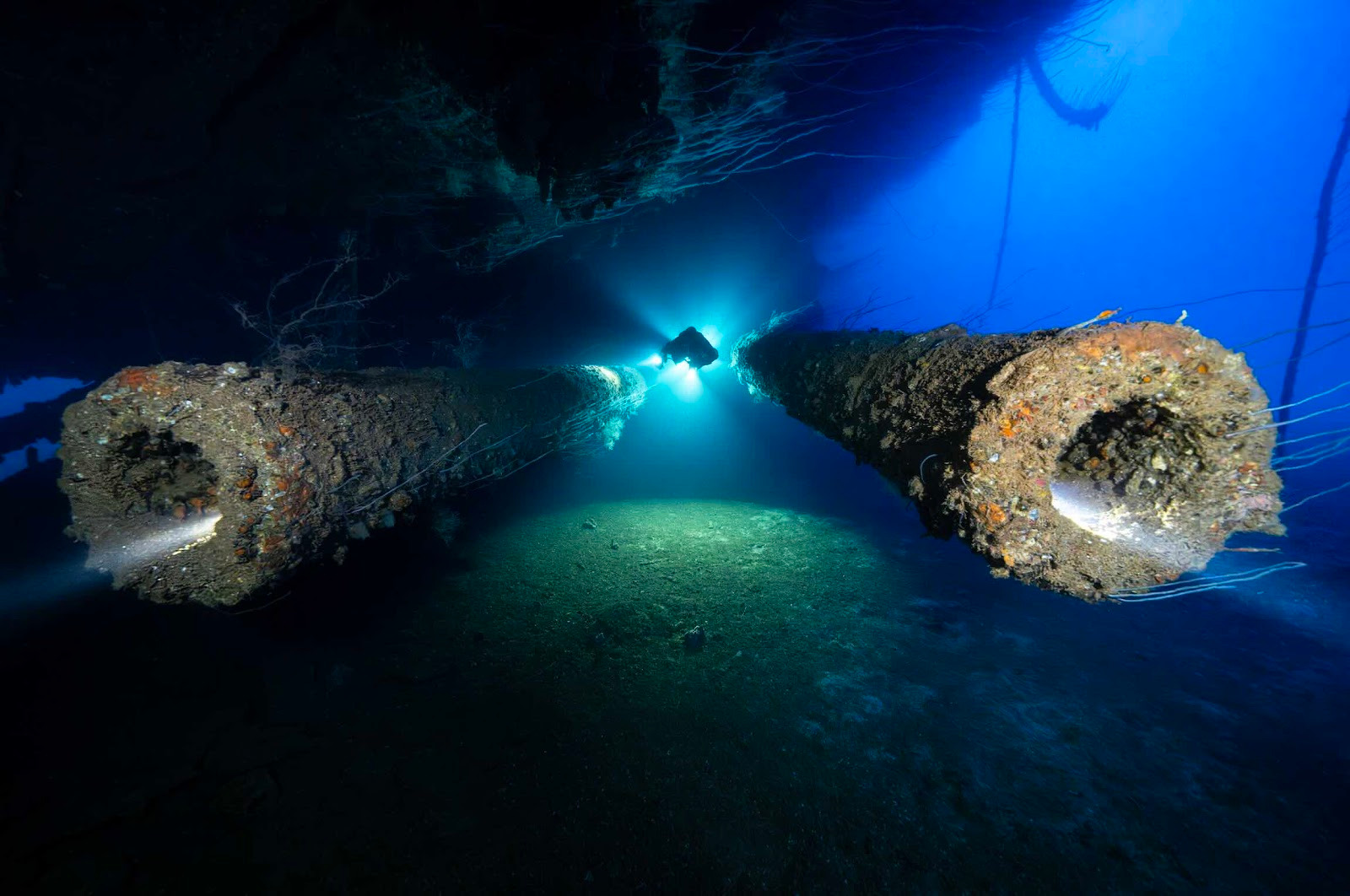 Aujourd’hui, l’épave repose renversée à environ 52 mètres de profondeur. Une plongée technique, exigeante, mais d’une richesse exceptionnelle. Dès la descente, apparaissent les quatre imposantes hélices, suspendues dans le bleu. Plus loin, les deux canons de poupe, plus impressionnants encore lorsqu’on les aborde par bâbord, figurent parmi les éléments les plus spectaculaires du site.