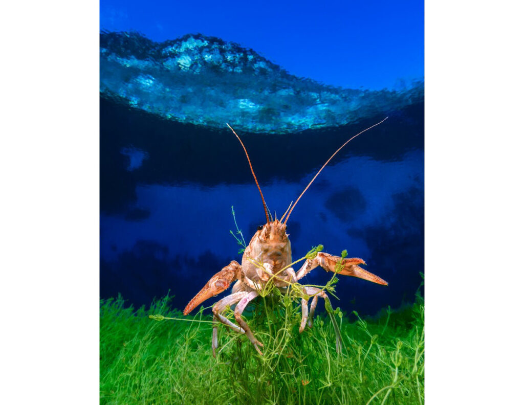La vie y est discrète. Pourtant, parmi les herbiers aquatiques, j’ai repéré une écrevisse à pattes blanches (Austropotamobius pallipes). Intrépide, elle s’est approchée jusqu’à frôler mon dôme encore perlé d’eau. Coincé par la faible hauteur du caisson, incapable d’utiliser l’écran arrière, j’ai dû cadrer à l’aveugle, tenant l’appareil d’une main et un flash de l’autre.