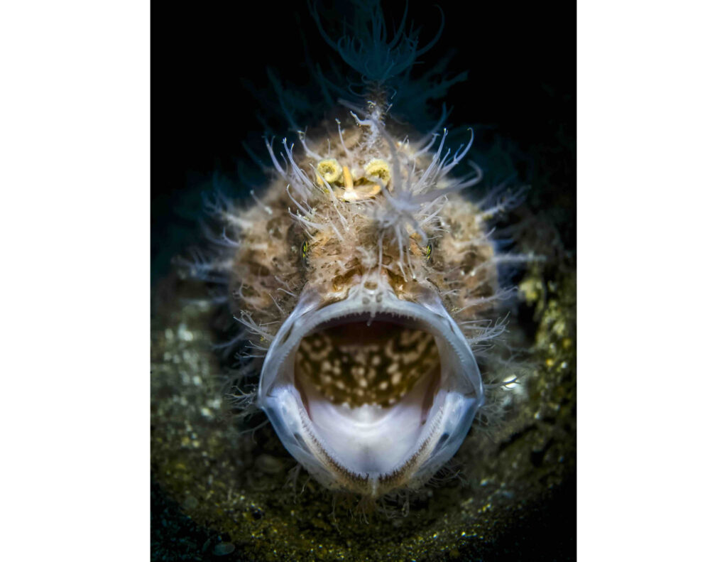 Alors que j’explorais un fond sableux à environ 15 mètres de profondeur, dans le détroit de Lembeh en Indonésie, mon regard a fini par distinguer la silhouette presque invisible d’un poisson-grenouille. Parfaitement camouflé, il patientait immobile, prêt à happer la moindre proie imprudente.